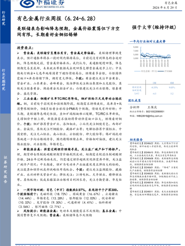 【华福证券】【20240629】20240629-华福证券-有色金属行业周报:美联储表态影响降息预期,金属价格震荡但下方空间有限,长期看好金铜铝锡锑-15页