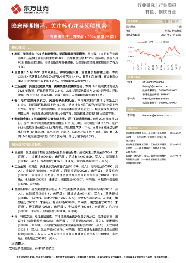 【东方证券】【20240702】20240702-东方证券-有色钢铁行业周观点(2024年第25周):降息预期增强,关注核心龙头超额机会-38页