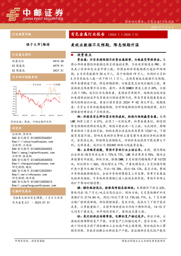 【中邮证券】【20240706】20240706-中邮证券-有色金属行业报告:美就业数据不及预期,降息预期升温-14页