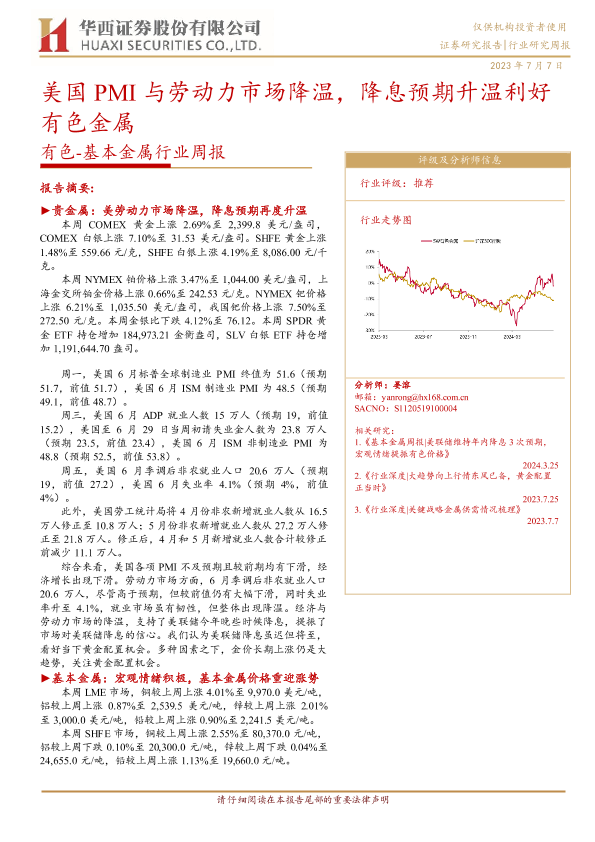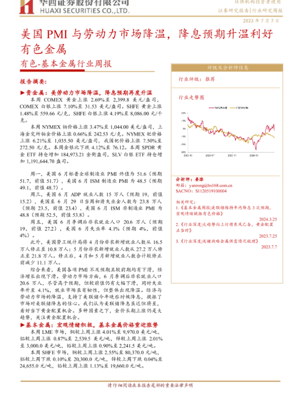 【华西证券】【20240707】20240707-华西证券-有色-基本金属行业周报:美国PMI与劳动力市场降温,降息预期升温利好有色金属-21页