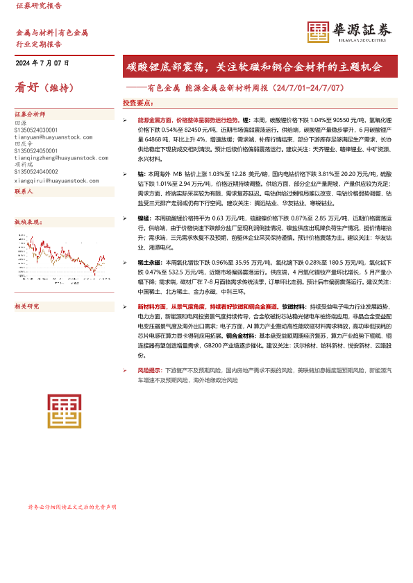 【华源证券】【20240707】20240707-华源证券-有色金属能源金属&新材料周报:碳酸锂底部震荡,关注软磁和铜合金材料的主题机会-15页
