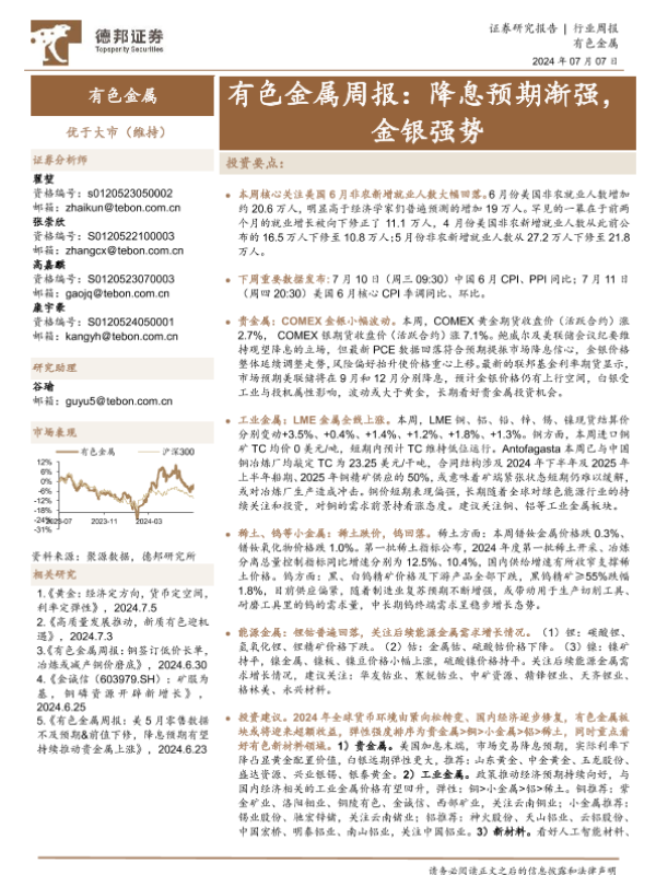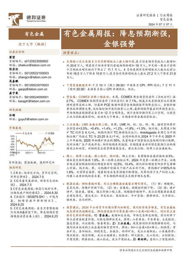 【德邦证券】【20240707】20240707-德邦证券-有色金属行业周报:降息预期渐强,金银强势-26页