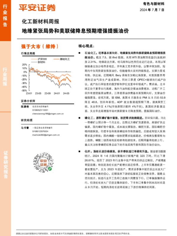 【平安证券】【20240707】20240707-平安证券-化工新材料行业周报:地缘紧张局势和美联储降息预期增强提振油价-15页