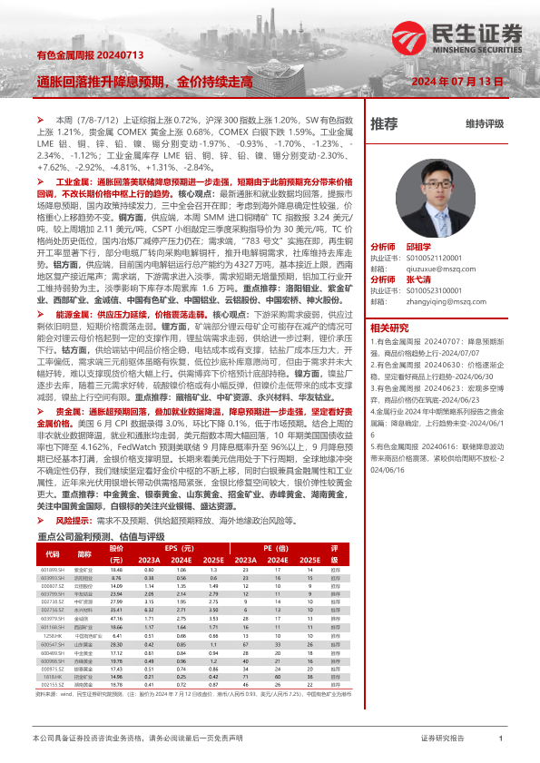 【民生证券】【20240713】20240713-民生证券-有色金属周报:通胀回落推升降息预期,金价持续走高-29页