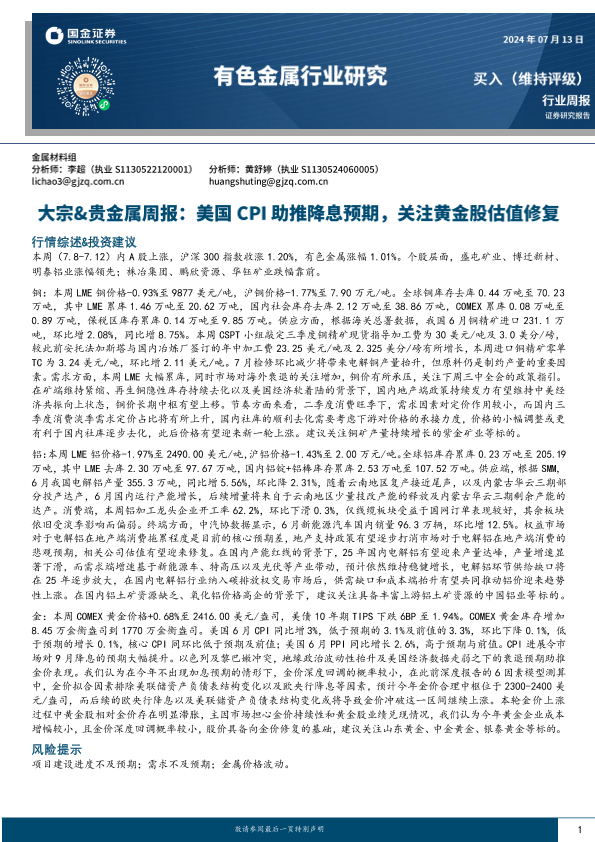 【国金证券】【20240713】20240713-国金证券-有色金属行业大宗&贵金属周报:美国CPI助推降息预期,关注黄金股估值修复-15页
