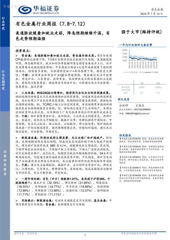 【华福证券】【20240714】20240714-华福证券-有色金属行业周报:美通胀放缓叠加就业走弱,降息预期继续升温,有色走势预期偏强-16页
