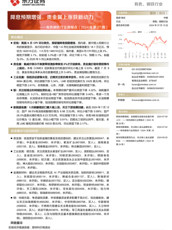 【东方证券】【20240715】20240715-东方证券-有色钢铁行业周观点(2024年第27周):降息预期增强,贵金属上涨获新动力-36页
