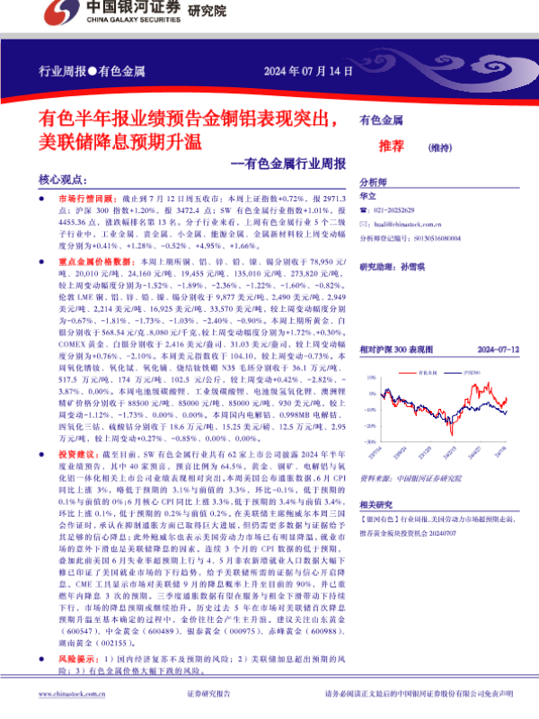 【银河证券】【20240714】20240714-中国银河-有色金属行业周报:有色半年报业绩预告金铜铝表现突出,美联储降息预期升温-17页