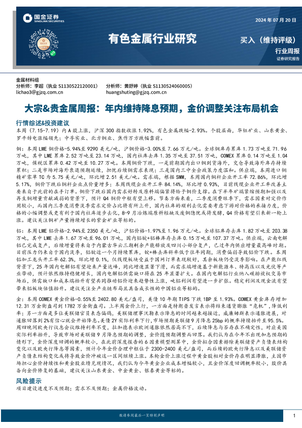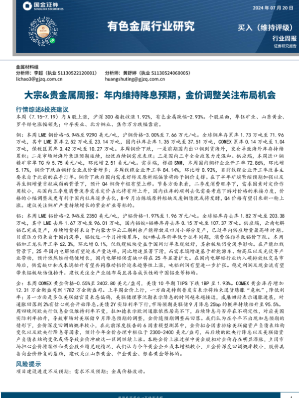 【国金证券】【20240720】20240720-国金证券-大宗&贵金属周报:年内维持降息预期,金价调整关注布局机会-15页