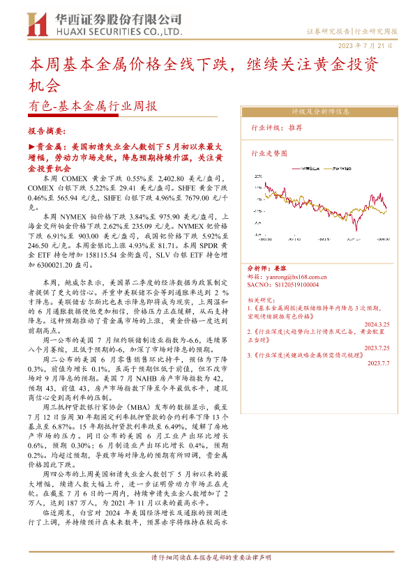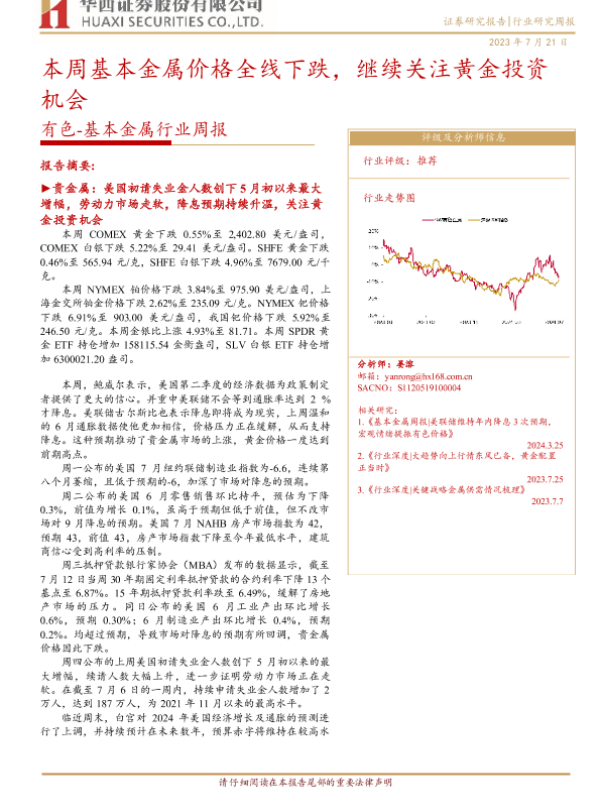 【华西证券】【20240721】20240721-华西证券-有色-基本金属行业周报:本周基本金属价格全线下跌,继续关注黄金投资机会-32页
