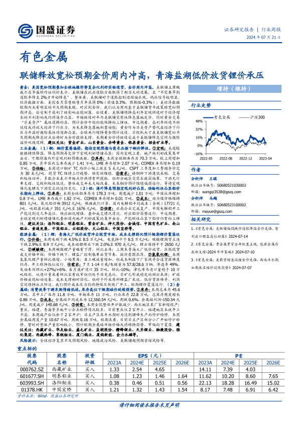 【国盛证券】【20240721】20240721-国盛证券-有色金属行业周报:联储释放宽松预期金价周内冲高,青海盐湖低价放货锂价承压-32页
