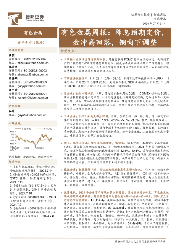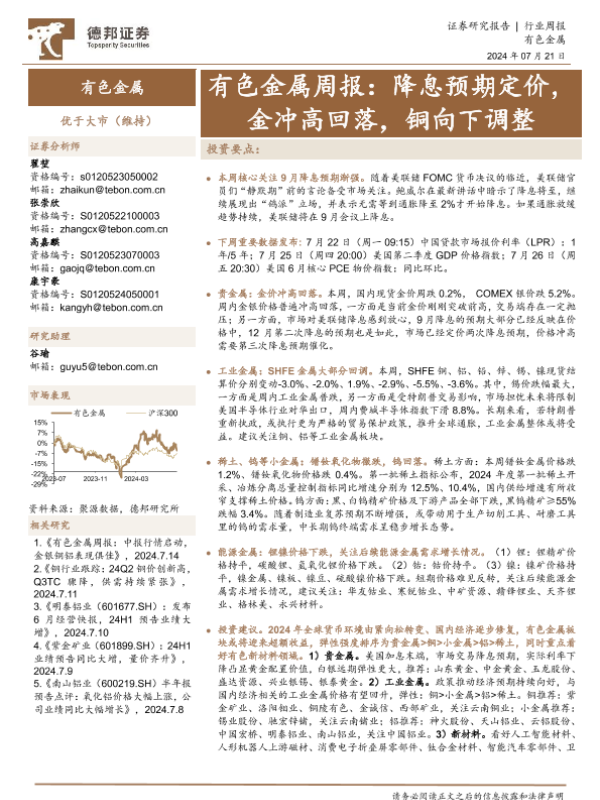 【德邦证券】【20240721】20240721-德邦证券-有色金属周报:降息预期定价,金冲高回落,铜向下调整-27页