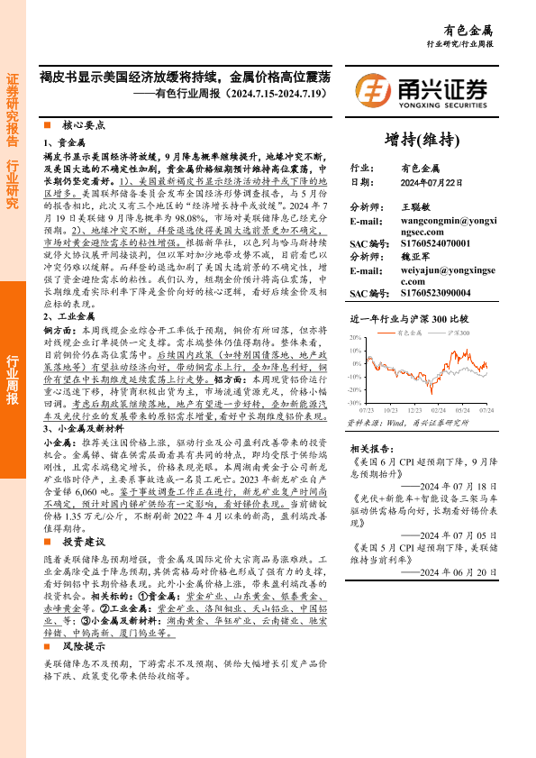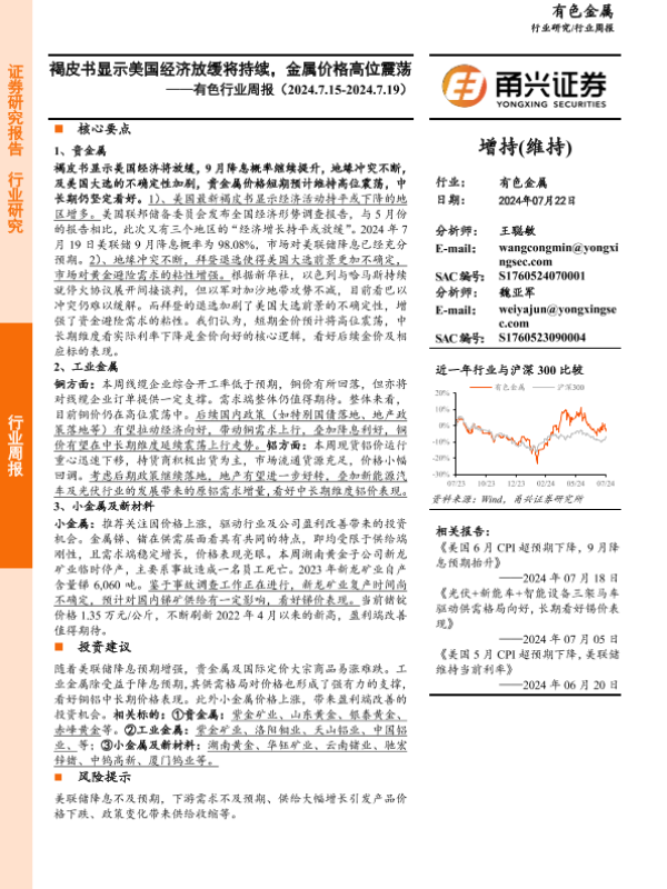 【甬兴证券】【20240722】20240722-甬兴证券-有色行业周报:褐皮书显示美国经济放缓将持续,金属价格高位震荡-18页