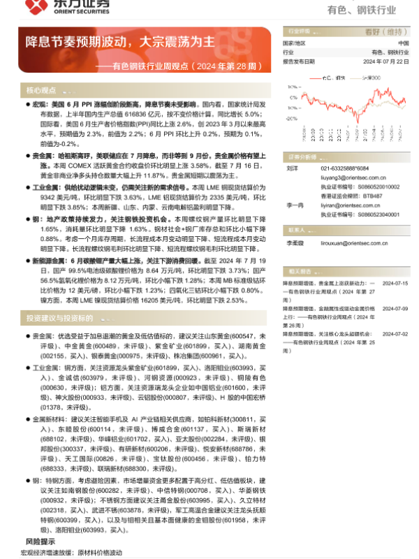 【东方证券】【20240722】2024年第28周有色钢铁行业周观点:降息节奏预期波动,大宗震荡为主-36页