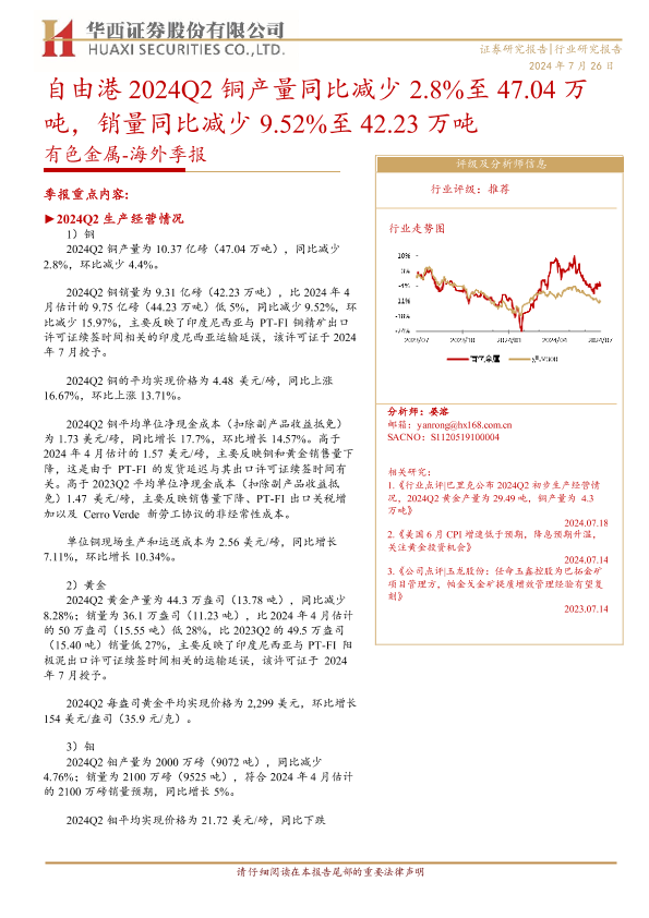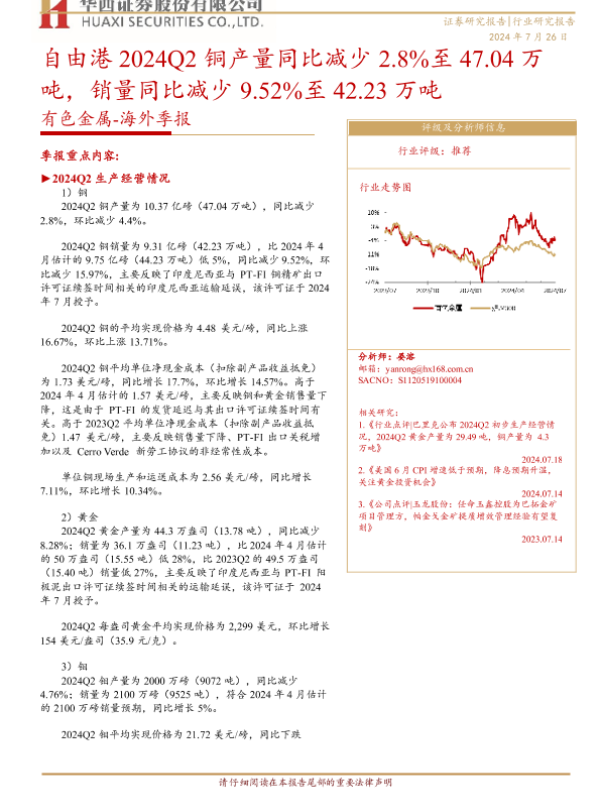 【华西证券】【20240726】20240726-华西证券-有色金属-海外季报:自由港2024Q2铜产量同比减少2.8%至47.04万吨,销量同比减少9.52%至42.23万吨-11页