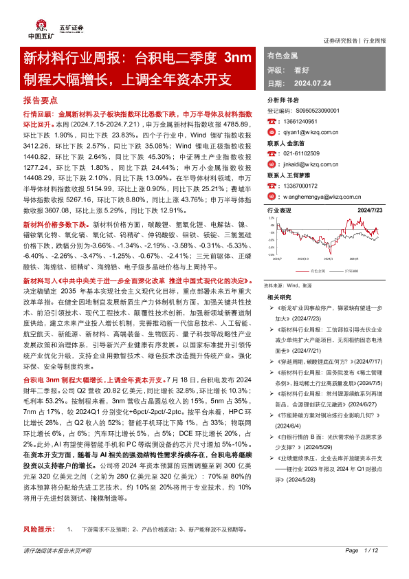 【五矿证券】【20240724】新材料行业周报:台积电二季度3nm制程大幅增长,上调全年资本开支-12页