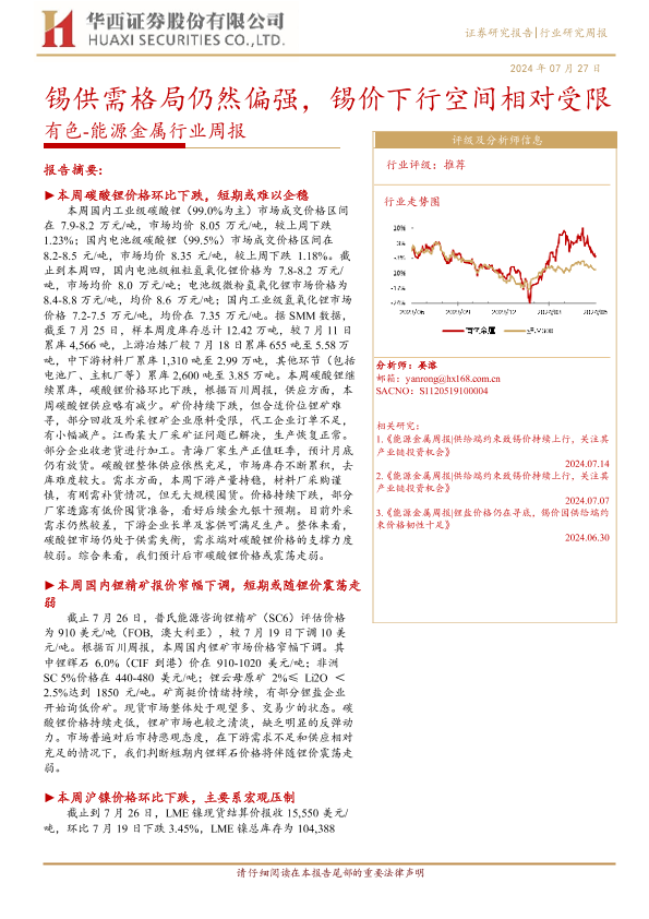 【华西证券】【20240727】20240727-华西证券-有色-能源金属行业周报:锡供需格局仍然偏强,锡价下行空间相对受限-28页