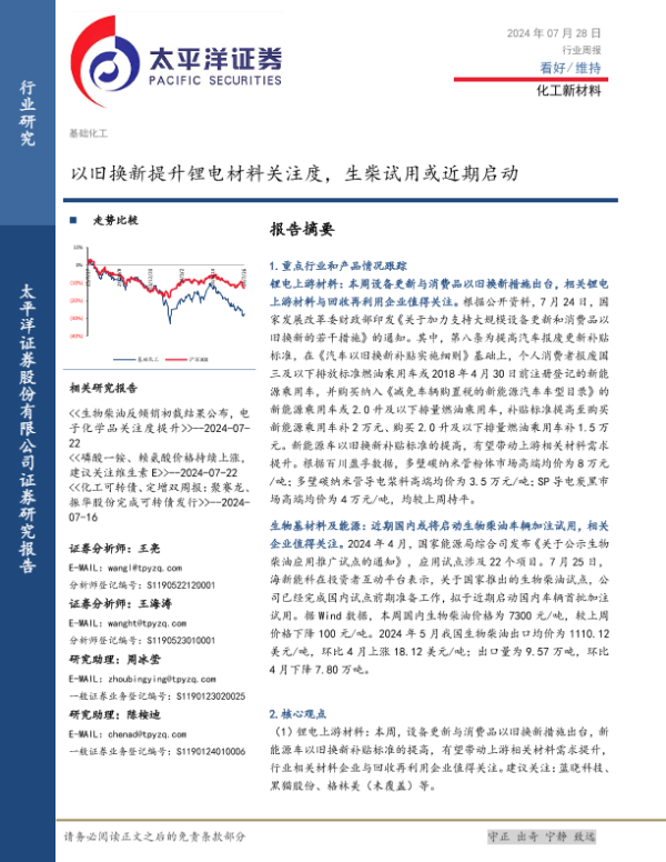 【太平洋证券】【20240728】20240728-太平洋-化工新材料行业周报:以旧换新提升锂电材料关注度,生柴试用或近期启动-42页