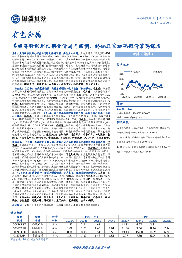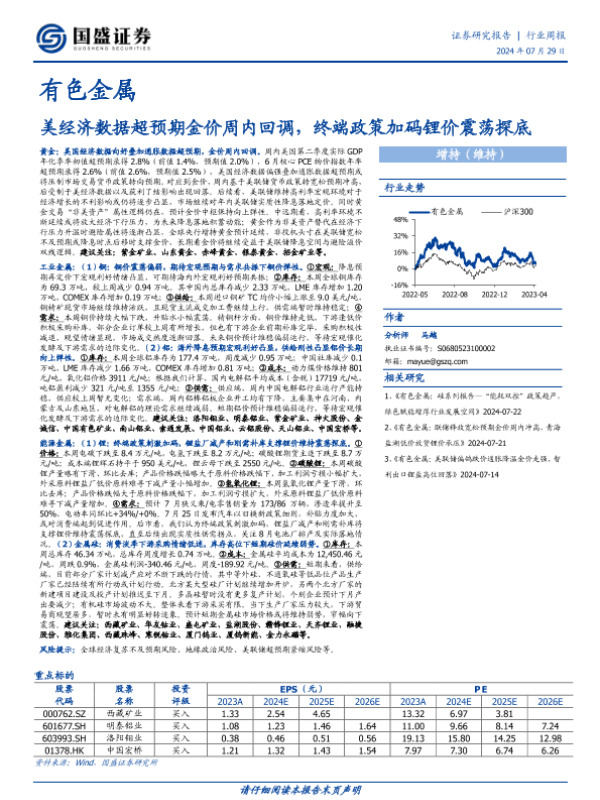 【国盛证券】【20240729】20240729-国盛证券-有色金属行业周报:美经济数据超预期金价周内回调,终端政策加码锂价震荡探底-31页