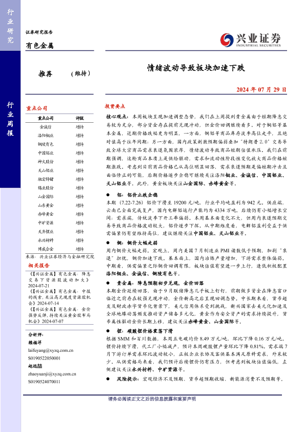 【兴业证券】【20240729】20240729-兴业证券-有色金属行业周报:情绪波动导致板块加速下跌-29页
