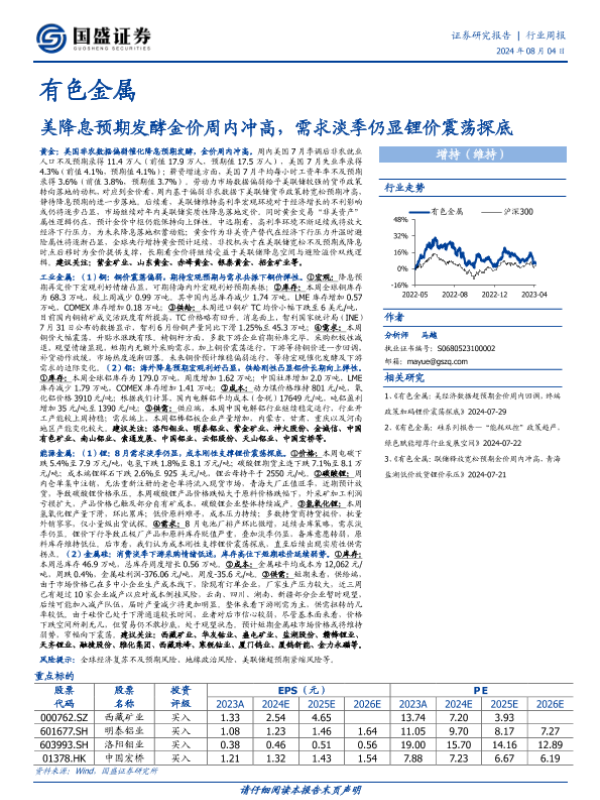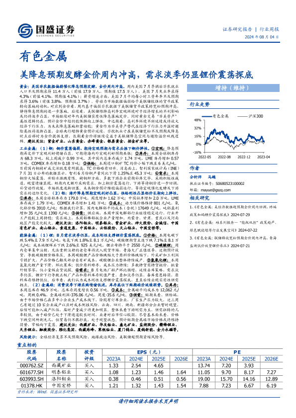【国盛证券】【20240804】20240804-国盛证券-有色金属行业周报:美降息预期发酵金价周内冲高,需求淡季仍显锂价震荡探底-31页