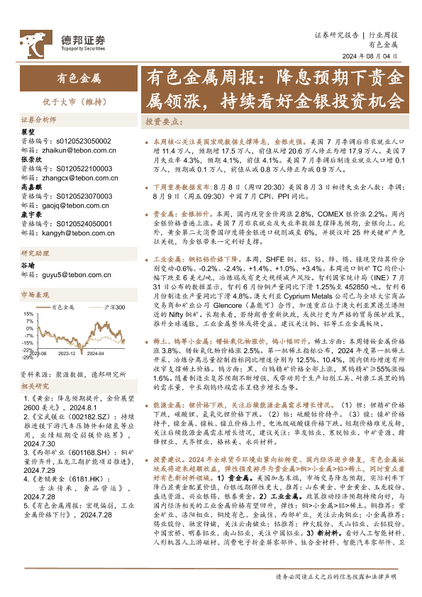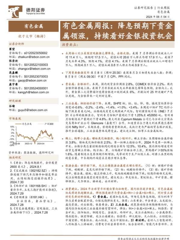 【德邦证券】【20240804】20240804-德邦证券-有色金属周报:降息预期下贵金属领涨,持续看好金银投资机会-25页