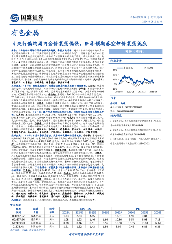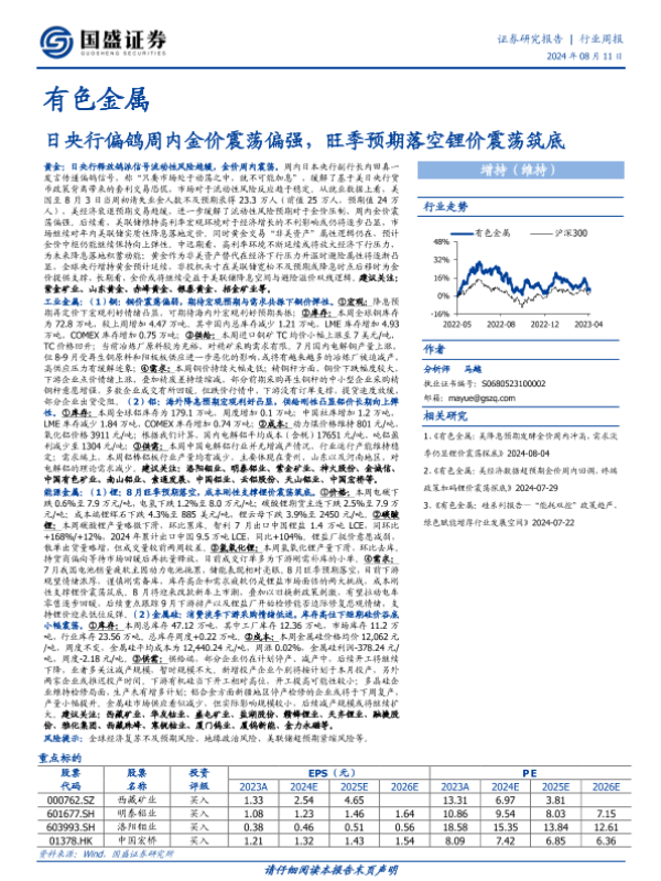 【国盛证券】【20240811】20240811-国盛证券-有色金属行业周报:日央行偏鸽周内金价震荡偏强,旺季预期落空锂价震荡筑底-31页