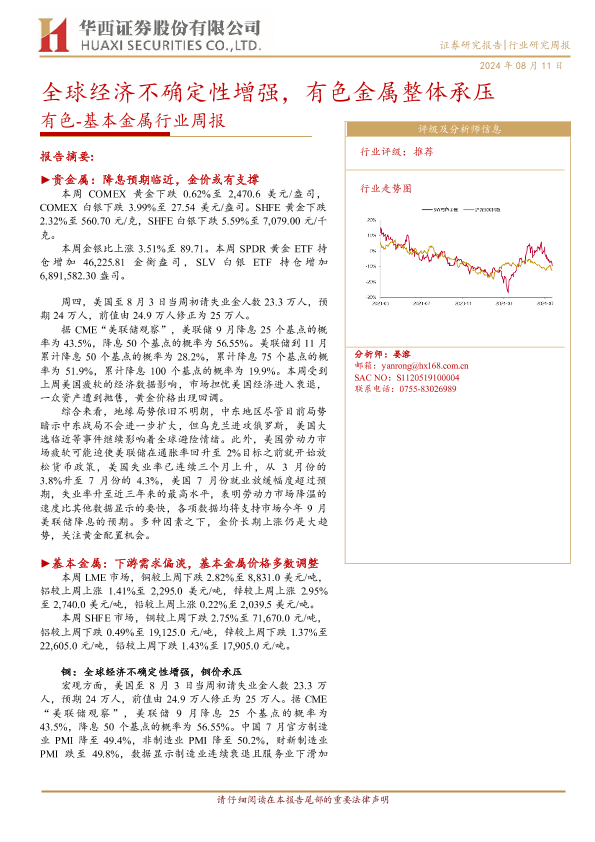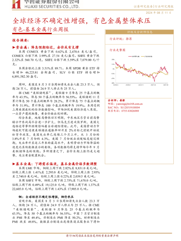 【华西证券】【20240811】20240811-华西证券-有色-基本金属行业周报:全球经济不确定性增强,有色金属整体承压-30页
