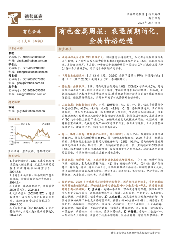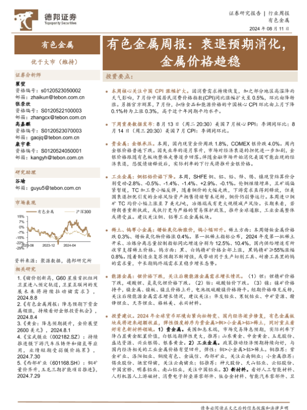 【德邦证券】【20240811】20240811-德邦证券-有色金属行业周报:衰退预期消化,金属价格趋稳-26页