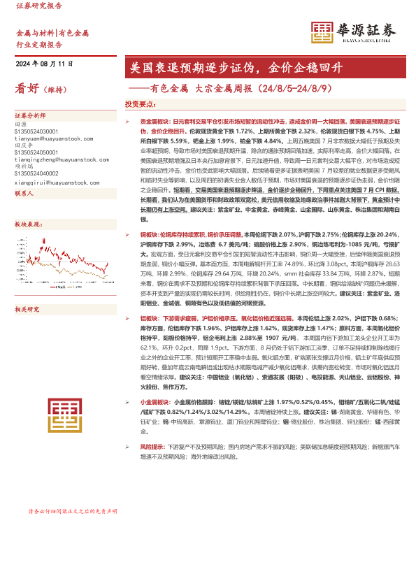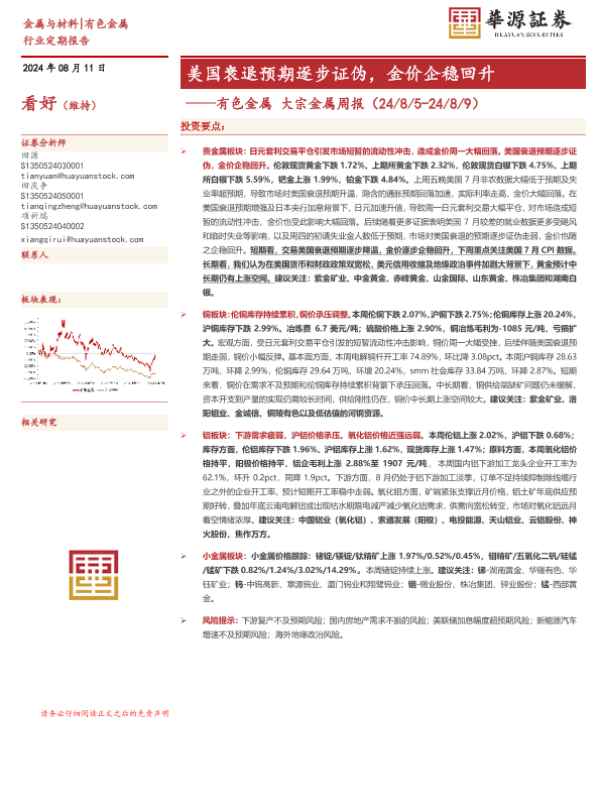 【华源证券】【20240811】20240811-华源证券-有色金属 大宗金属周报:美国衰退预期逐步证伪,金价企稳回升-18页