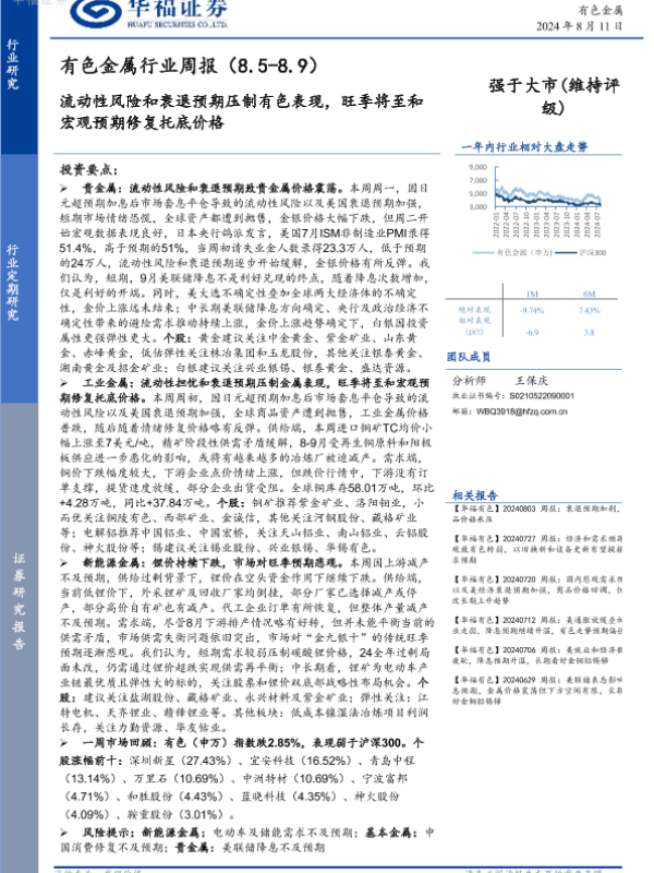 【华福证券】【20240811】20240811-华福证券-有色金属行业周报:流动性风险和衰退预期压制有色表现,旺季将至和宏观预期修复托底价格-15页