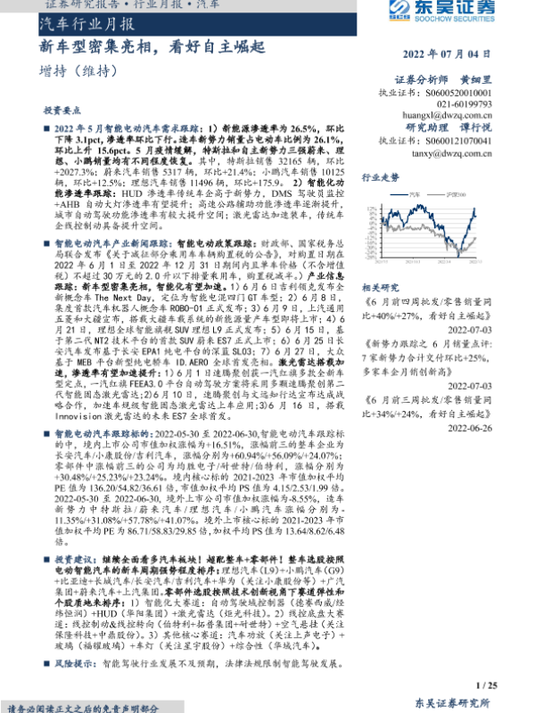 【东吴证券】【20220704】汽车行业月报:新车型密集亮相,看好自主崛起-25页