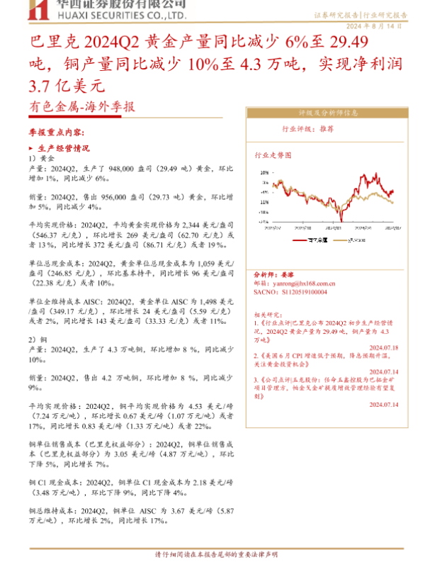 【华西证券】【20240814】巴里克2024Q2黄金产量同比减少6%至29.49吨,铜产量同比减少10%至4.3万吨,实现净利润3.7亿美元-11页