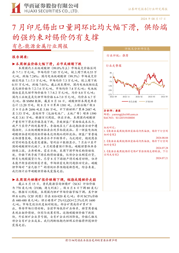 【华西证券】【20240817】20240817-华西证券-有色-能源金属行业周报:7月印尼锡出口量同环比均大幅下滑,供给端的强约束对锡价仍有支撑-29页