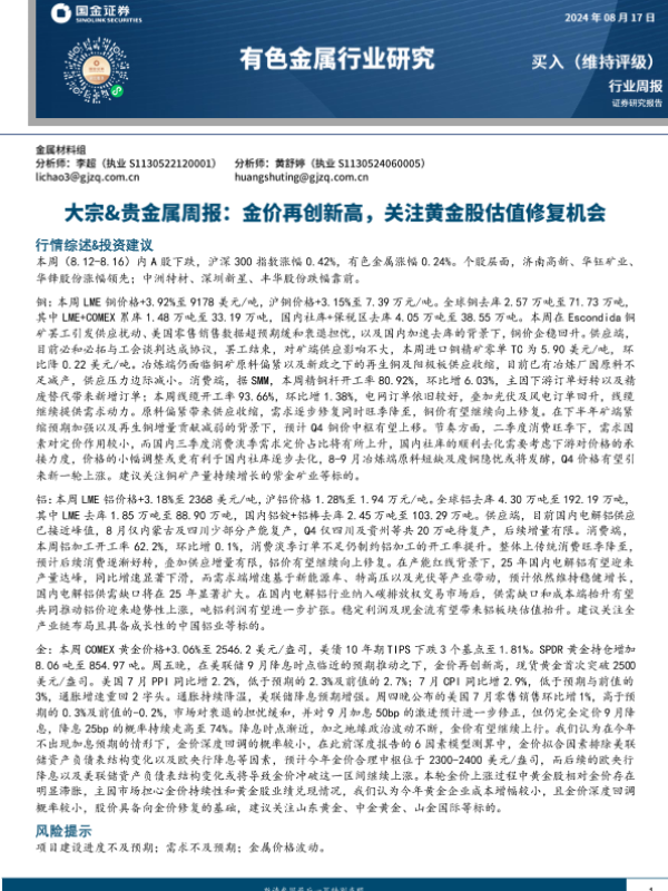 【国金证券】【20240817】20240817-国金证券-有色金属行业大宗&贵金属周报:金价再创新高,关注黄金股估值修复机会-15页