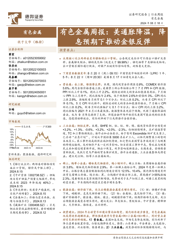 【德邦证券】【20240818】20240818-德邦证券-有色金属行业周报:美通胀降温,降息预期下推动金银反弹-27页