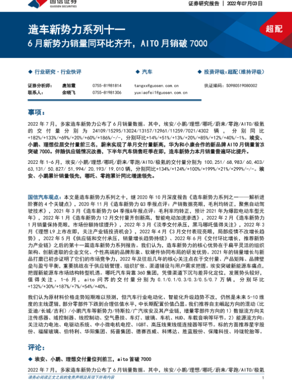 【国信证券】【20220703】汽车行业造车新势力系列十一:6月新势力销量同环比齐升,AITO月销破7000-20页