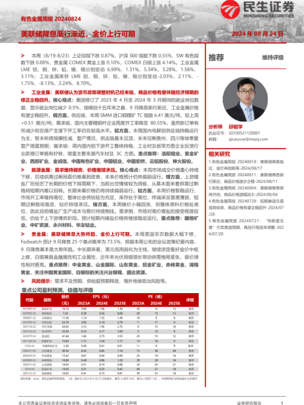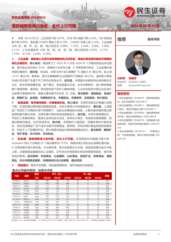 【民生证券】【20240824】20240824-民生证券-有色金属周报:美联储降息渐行渐近,金价上行可期-30页