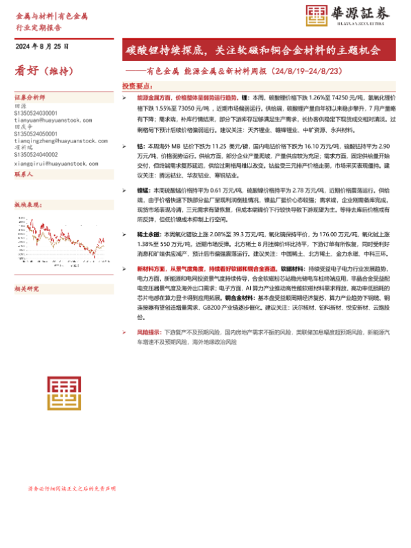 【华源证券】【20240825】20240825-华源证券-有色金属能源金属&新材料周报:碳酸锂持续探底,关注软磁和铜合金材料的主题机会-16页