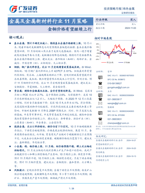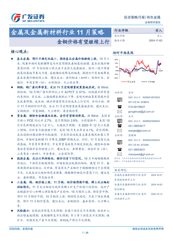 【广发证券】【20241103】金属及金属新材料行业11月策略:金铜价格有望继续上行-26页