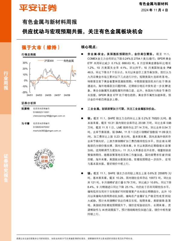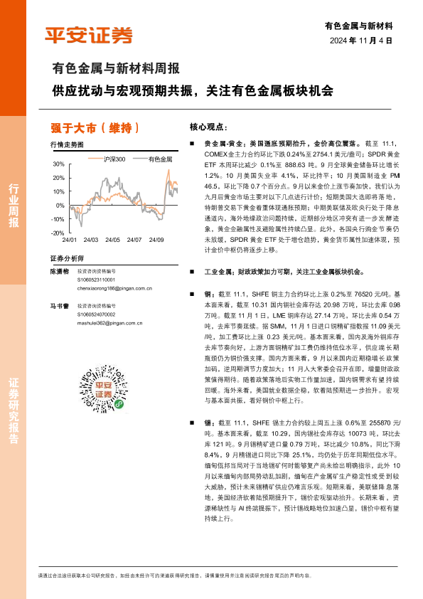 【平安证券】【20241104】20241104-平安证券-有色金属与新材料周报:供应扰动与宏观预期共振,关注有色金属板块机会-13页