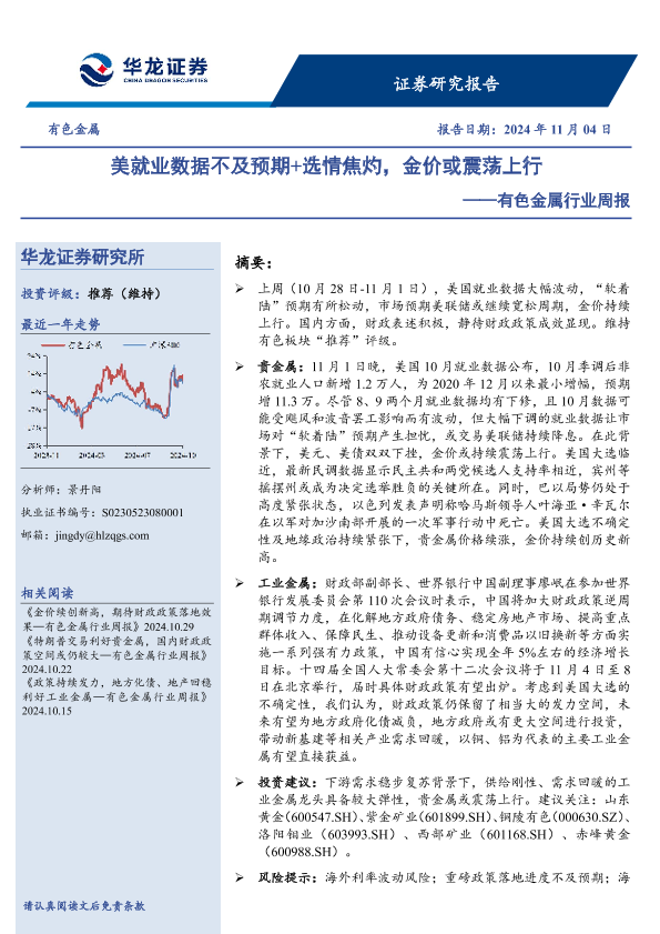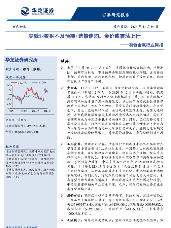 【华龙证券】【20241104】20241104-华龙证券-有色金属行业周报:美就业数据不及预期+选情焦灼,金价或震荡上行-13页