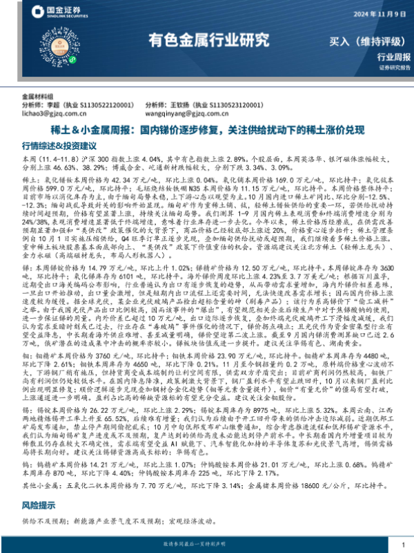 【国金证券】【20241109】20241109-国金证券-稀土&小金属周报:国内锑价逐步修复,关注供给扰动下的稀土涨价兑现-13页