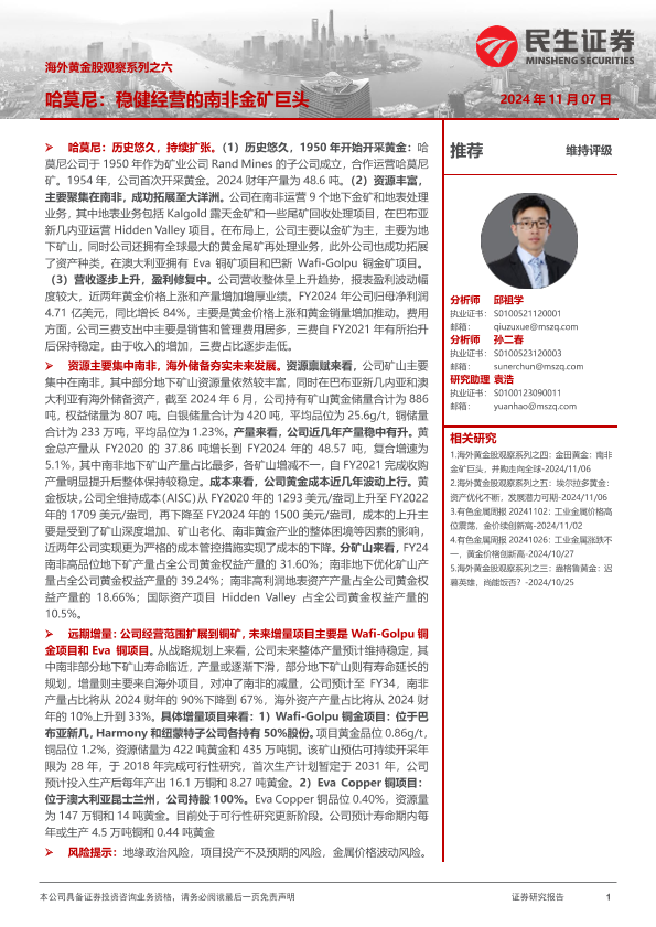 【民生证券】【20241107】海外黄金股观察系列之六:哈莫尼:稳健经营的南非金矿巨头-37页