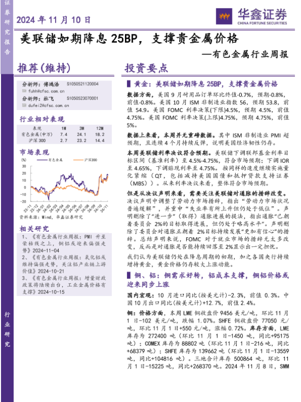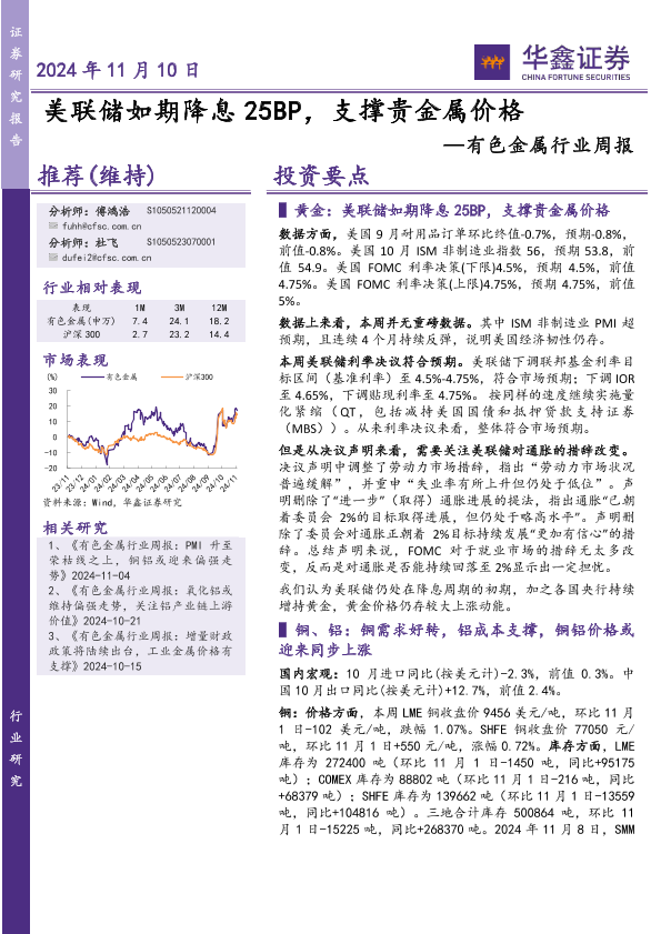 【华鑫证券】【20241110】20241110-华鑫证券-有色金属行业周报:美联储如期降息25BP,支撑贵金属价格-18页