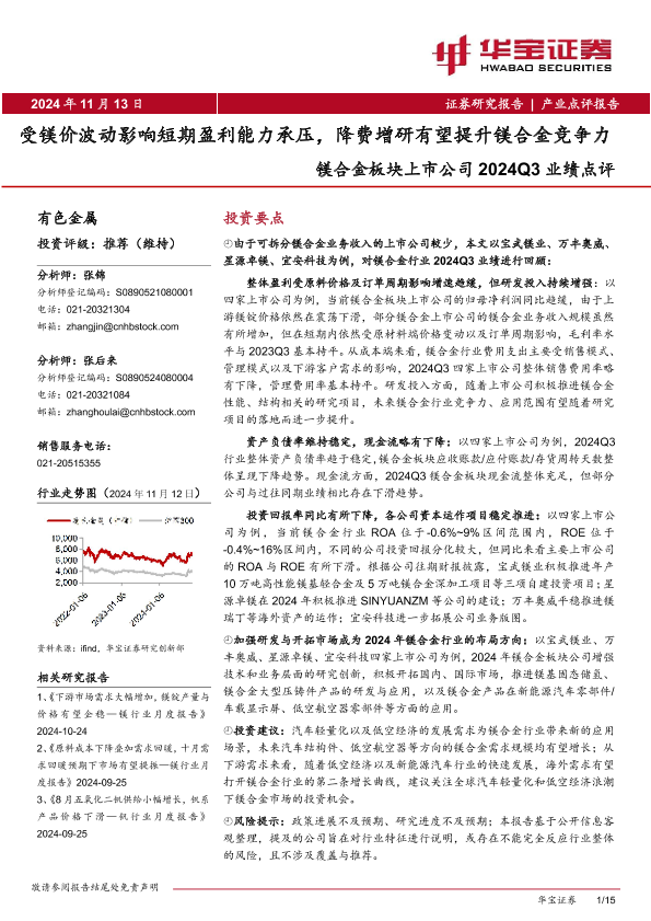 【华宝证券】【20241113】2024Q3业绩点评:受镁价波动影响短期盈利能力承压,降费增研有望提升镁合金竞争力-15页