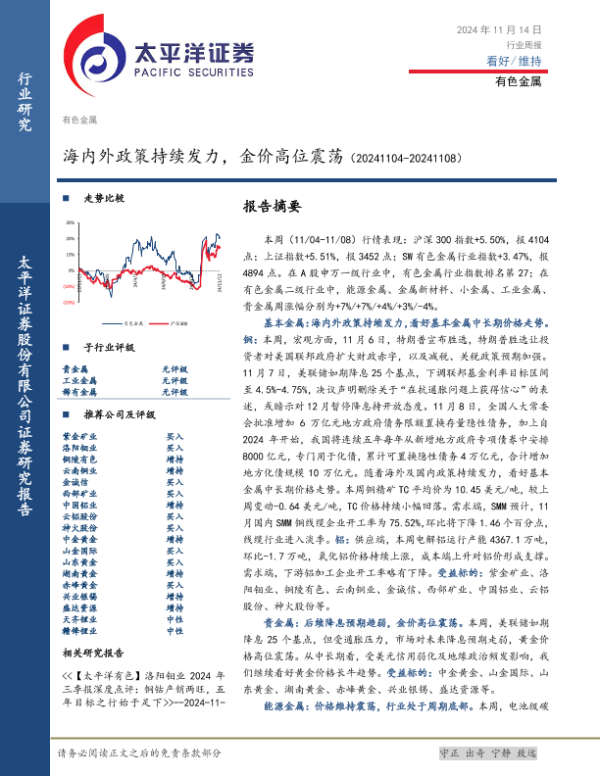 【太平洋证券】【20241114】20241114-太平洋-有色金属行业周报:海内外政策持续发力,金价高位震荡-23页