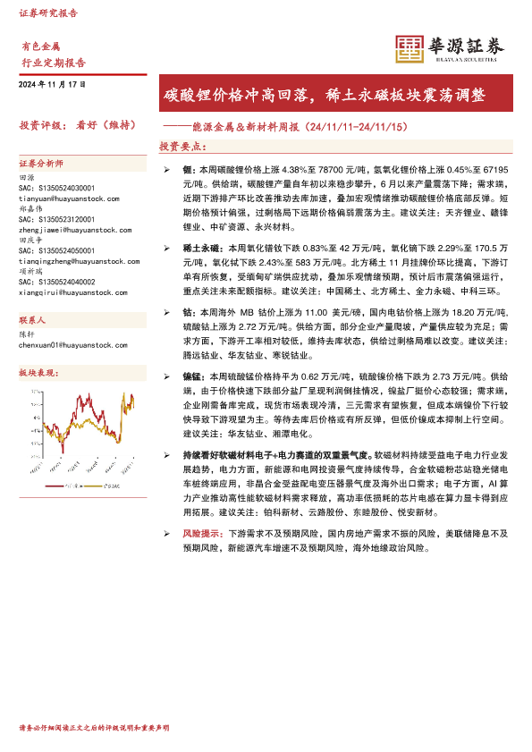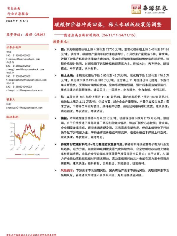 【华源证券】【20241117】20241117-华源证券-能源金属&新材料周报:碳酸锂价格冲高回落,稀土永磁板块震荡调整-15页