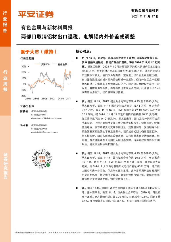 【平安证券】【20241117】20241117-平安证券-有色金属与新材料周报:两部门取消铝材出口退税,电解铝内外价差或调整-13页