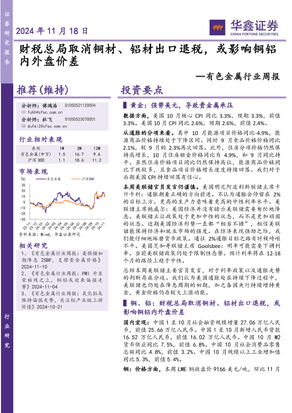 【华鑫证券】【20241118】20241118-华鑫证券-有色金属行业周报:财税总局取消铜材、铝材出口退税,或影响铜铝内外盘价差-20页
